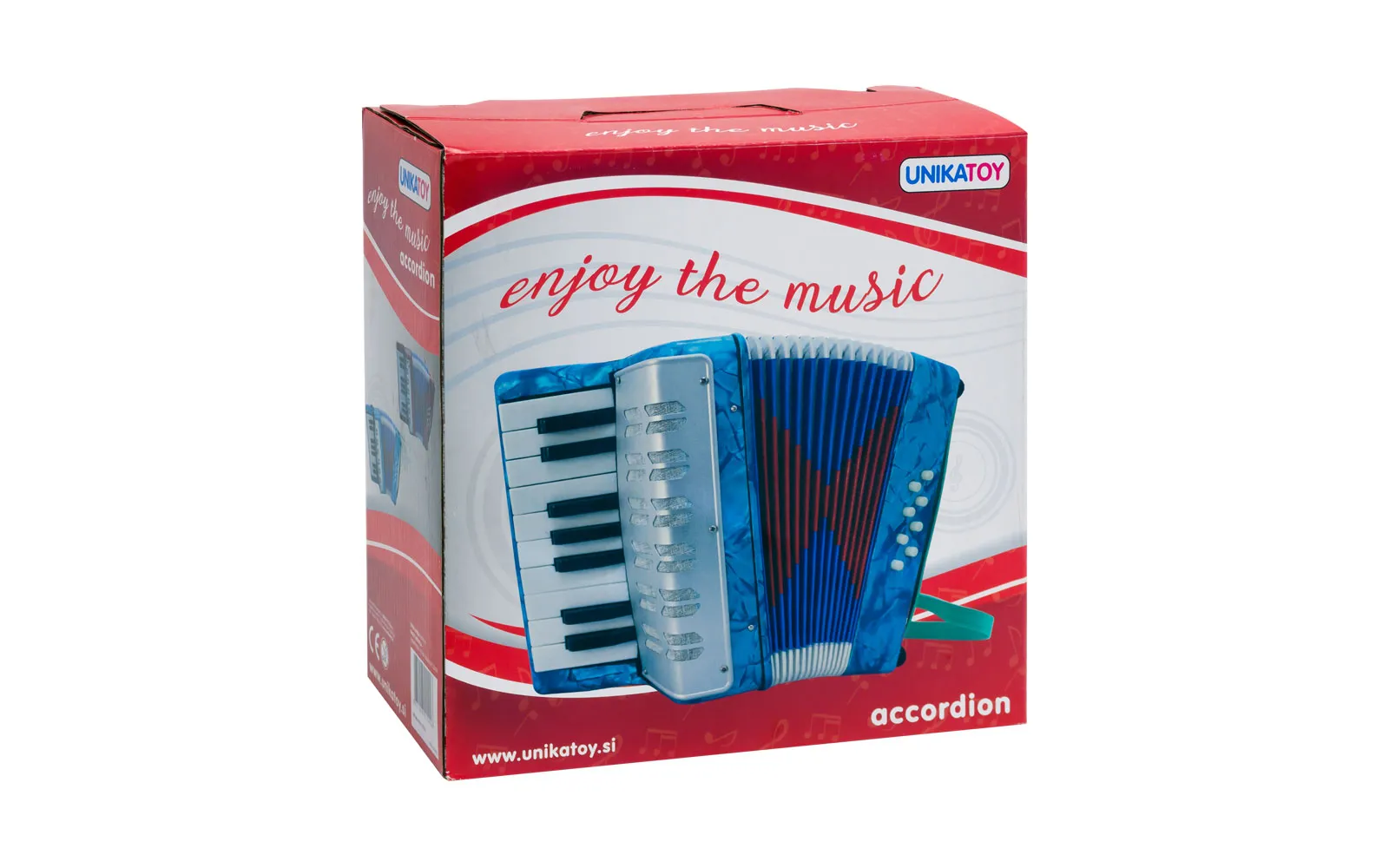 Start your musical adventure with an accordion! This beautiful blue accordion is designed for young music enthusiasts and offers a great opportunity for learning music and developing creativity. IDEAL FOR YOUNG MUSICIANS. With 17 keys and 8 basses, the accordion will allow children to play different melodies and rhythms, stimulating their imagination and love for music. The accordion is lightweight and easy to use, making it ideal for children who are first encountering musical instruments. QUALITY MANUFACTURING: The accordion is assembled from different materials, including wood, plastic, cardboard, and metal, ensuring durability and comfort when playing. Its dimensions of 23.5 x 11 x 23.5 cm make it suitable for small hands. PACKAGE INCLUDES: Blue accordion. The Unikatoy accordion set is the perfect choice for all children who want to start their musical journey and have fun creating beautiful sounds. Get ready for musical adventures and enjoy a world of melodies!