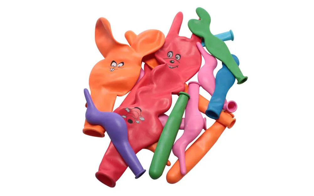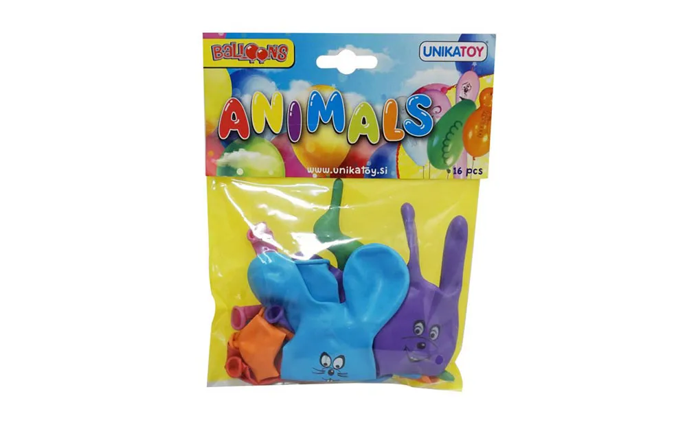 Different colors and shapes, there are balloons that, when inflated, resemble different animals. There are 16 balloons in the bag.