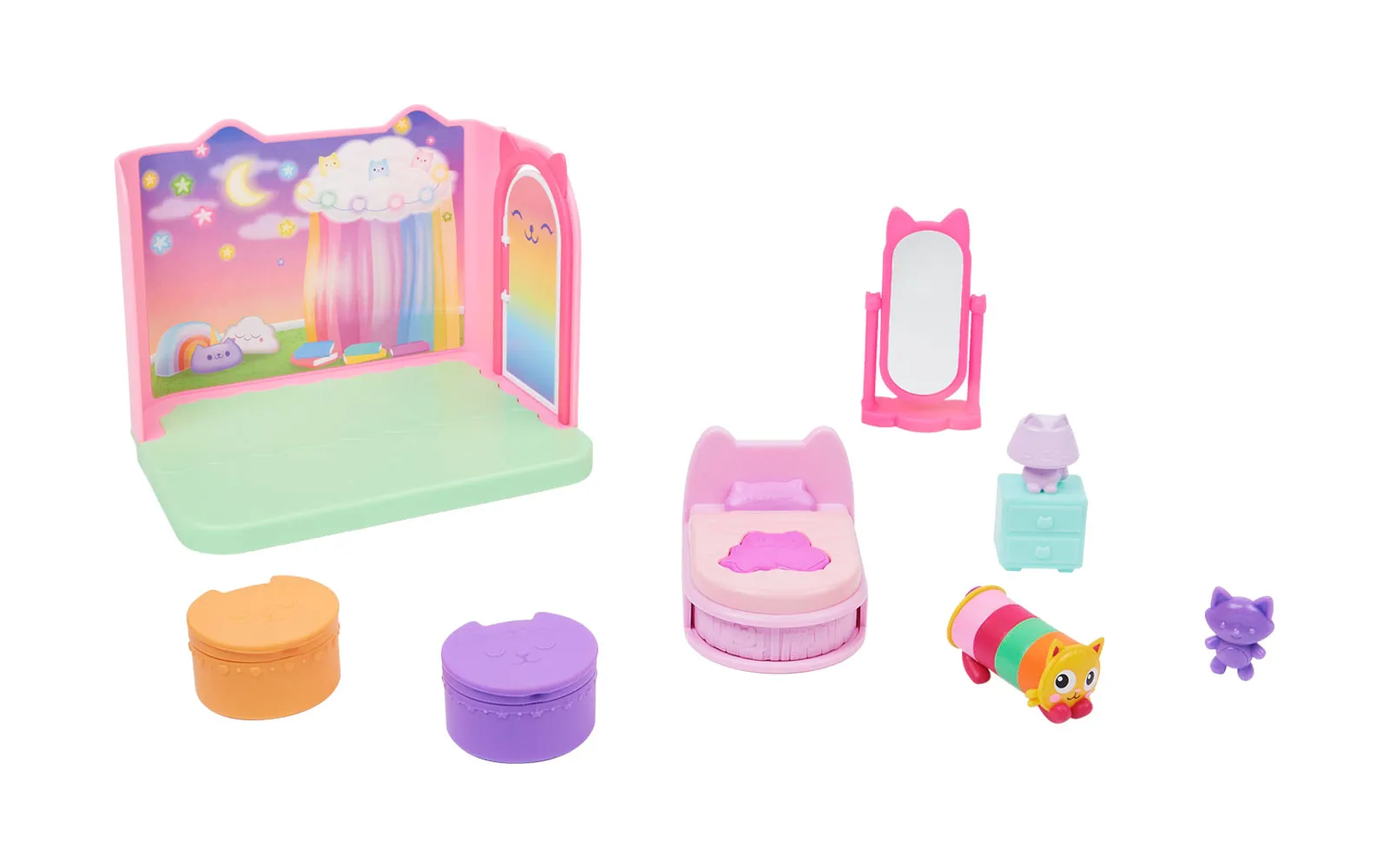 Bedroom set, Gabby’s dollhouse, Spin Master! CREATE A WONDERFUL WORLD FOR YOUR FIGURES! The beautiful Gabby’s Dollhouse bedroom is designed to become a true paradise for your figures! With this set, you will provide your toys with a comfortable and modern bedroom where they will rest after a long day of fun. IDEAL FOR SENSORY PLAY AND ADVENTURES: This set includes all the elements you need to create a perfect resting space. The bed, bedside table, and mirror will allow your characters to relax, and Mercat will enliven their world. The boxes are perfect for storing valuables. CONTENTS: 1 room, 1 bed, 1 bedside table, 1 mirror, 1 Mercat figure, 2 travel boxes. Gabby’s Dollhouse bedroom set will surely enrich your collection and allow for more inventive play.