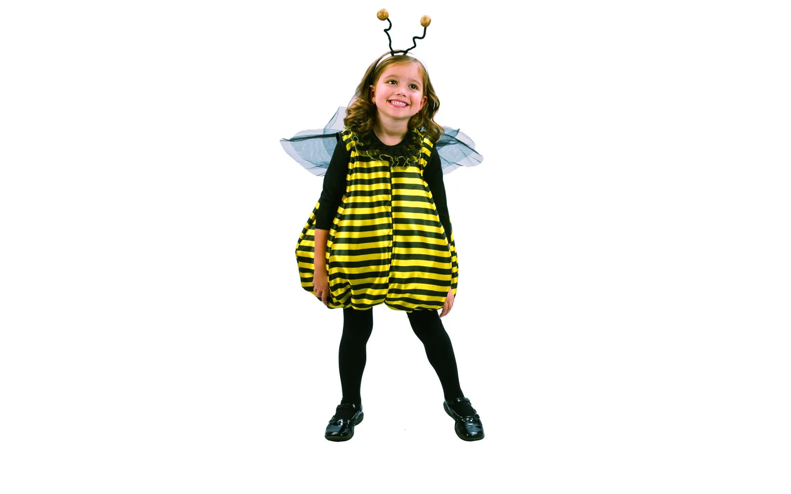 The bumblebee carnival costume for the youngest includes a dress and headband (black blouse, shoes and tights are not included). A headband with playful antennae and a dress with yellow and black stripes transform you into a real worker bee, flying around the carnival party. Size 92-104 cm. Composition: 100% POLYESTER.