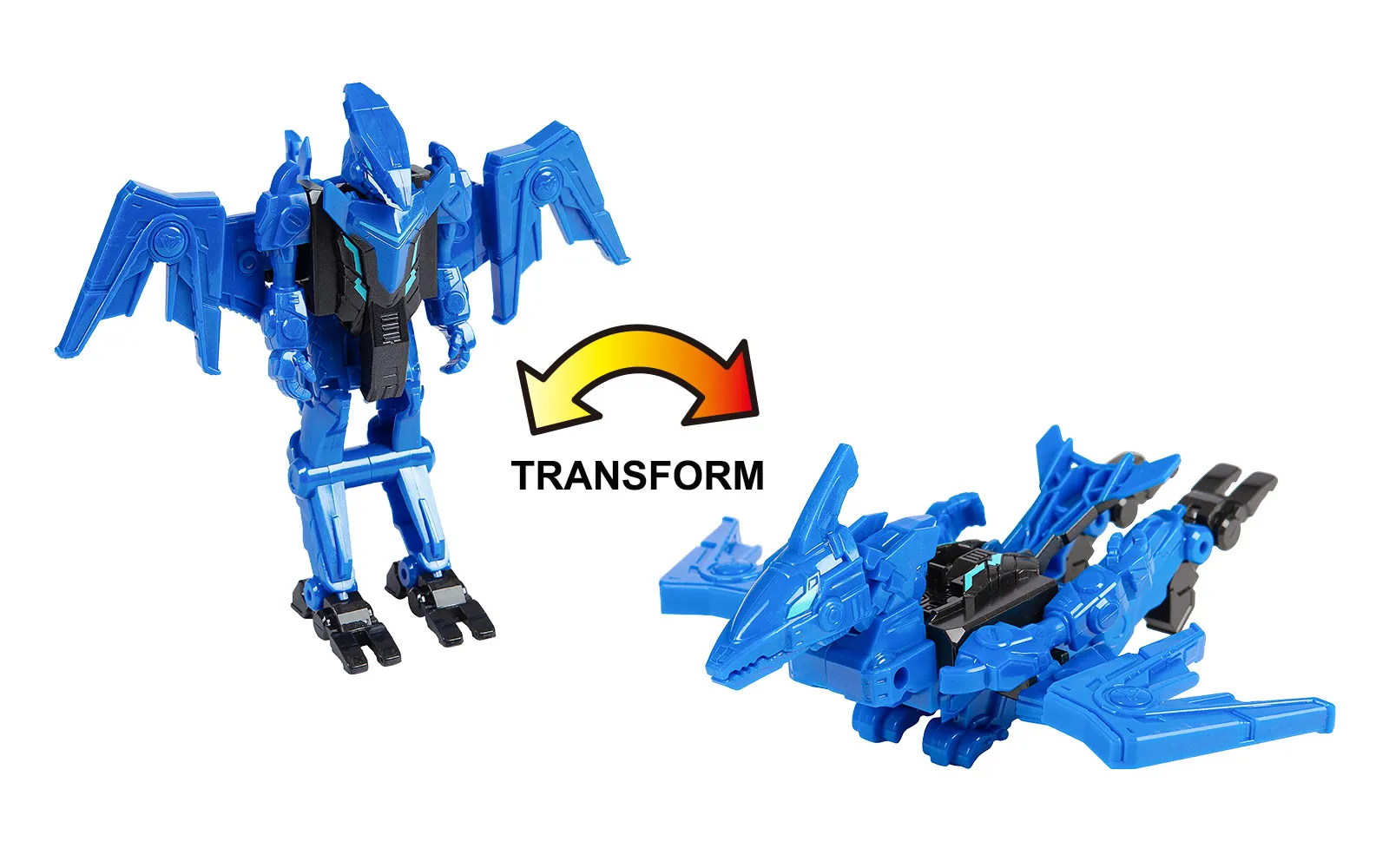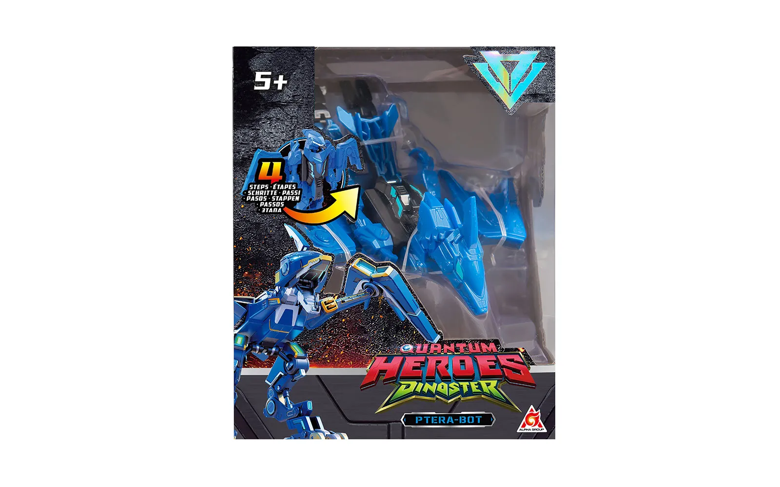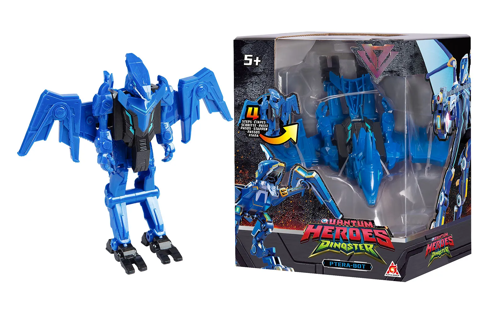 Discover the amazing world of dinosaurs with the Dinoster team! Through their adventures, four friends overcome big challenges to protect the dinosaurs. Welcome to the Dinoster team! Explore the world of dinosaurs and embark on an adventure with the ptero bot Jay Min. Jay Min is the technical genius of the team. He can understand all mechanisms. He likes to help, but not to be the hero. The 13cm Transformable Dino-Bot Jay Min easily switches from a dinosaur-suit action figure to a dino-bot in just four easy steps. Play with the action figure and complete all the missions from the cartoon or transform it into a dinobot.