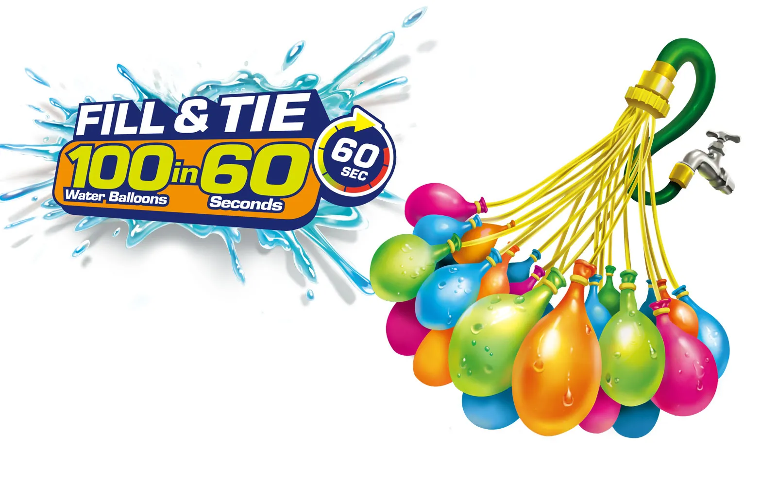 Fill and tie 100 water balloons in less than 60 seconds with these sensational self-tying water balloons! The Bunch O Balloons Tropical set includes three bunches of water balloons in different colors that tie themselves when filled with water. Each bunch contains about 35 water balloons.
