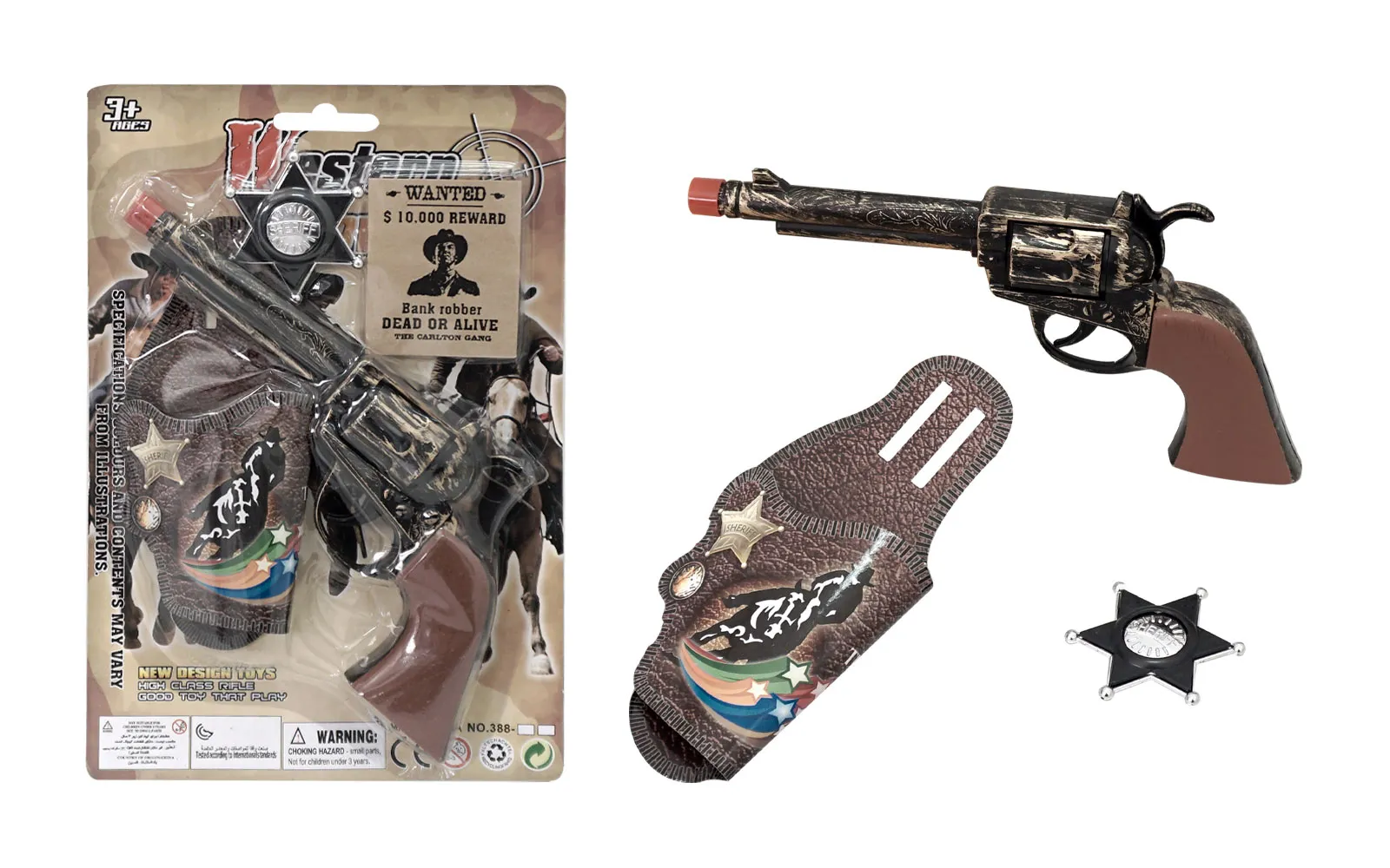 The cowboy set includes a pistol with a storage accessory and a sheriff’s badge.