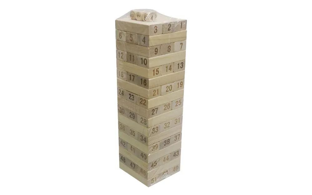 The game TOWER WOODEN or JENGA is a social game, in which players remove wooden blocks from the tower and place them on top of it. Jenga is played with 51 wooden blocks. The word jenga originates from kujenga, which means to build in Swahili.