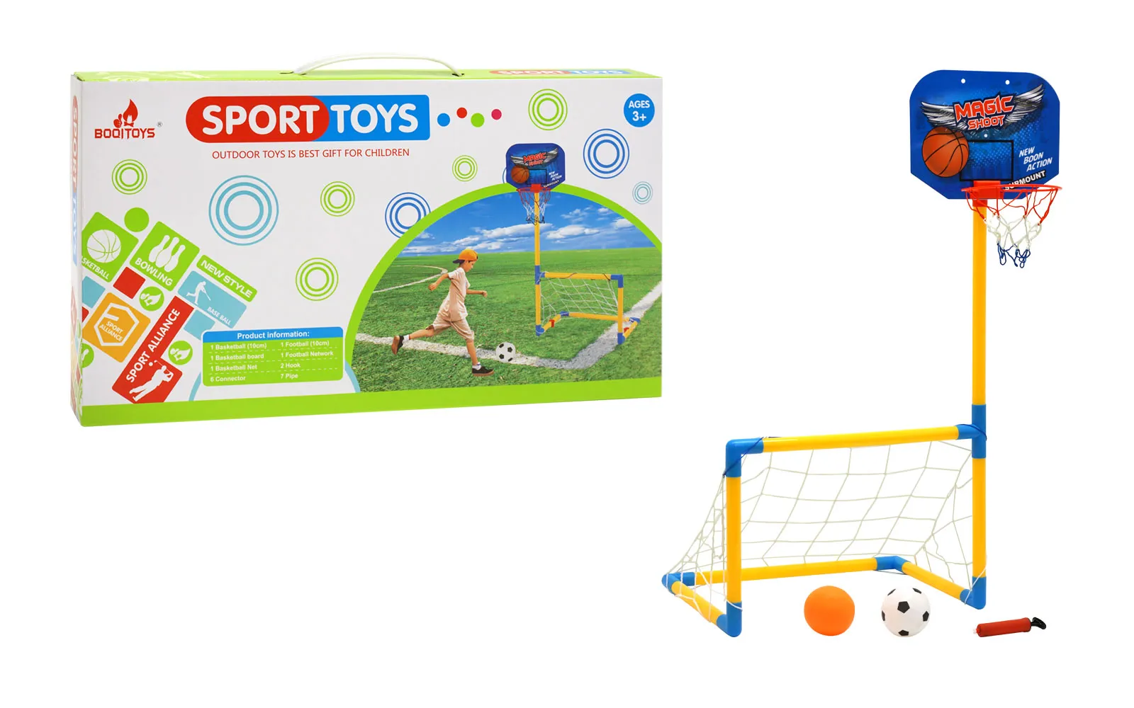 The set contains 1 basketball ball fi 10 cm, 1 soccer ball fi 10 cm, a pump and a goal basket together measuring 48x97x34 cm. Bare bars and couplings are made of PVC material.