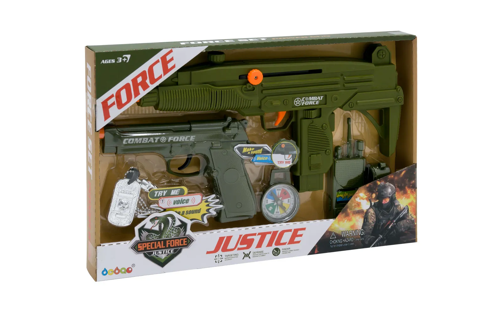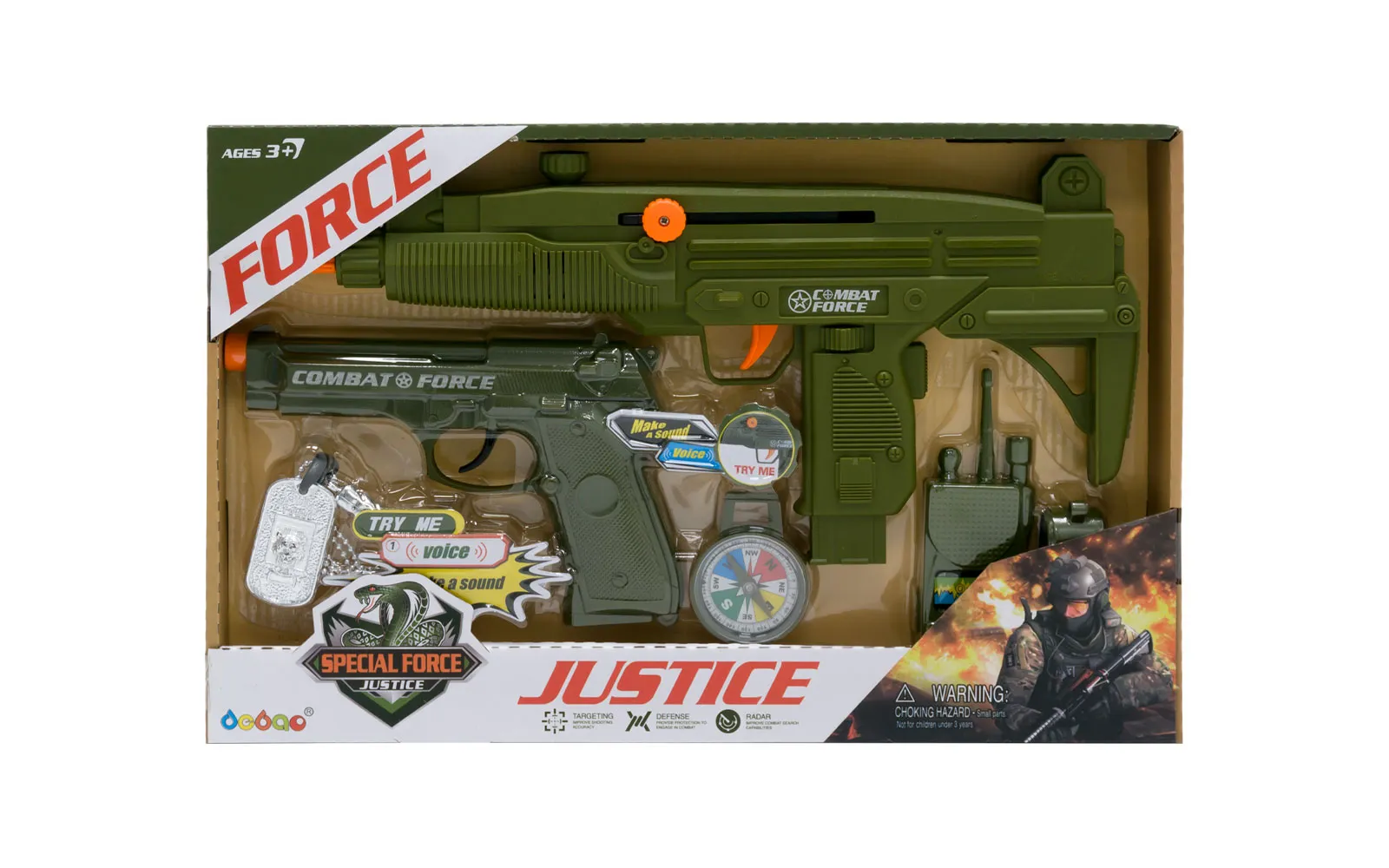 A military set with a machine gun that emits the sound of a machine gun. Pull back the orange button on the left side of the machine gun, press the trigger, and you will hear the sound of a machine gun.