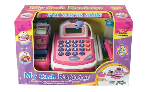 The battery-operated cash register has a working calculator, light, and microphone with various accessories. It requires 2 AA type batteries, which are not included.