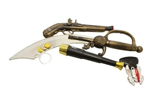 The pirate set includes, in addition to a pistol, saber, and telescope, some small accessories.