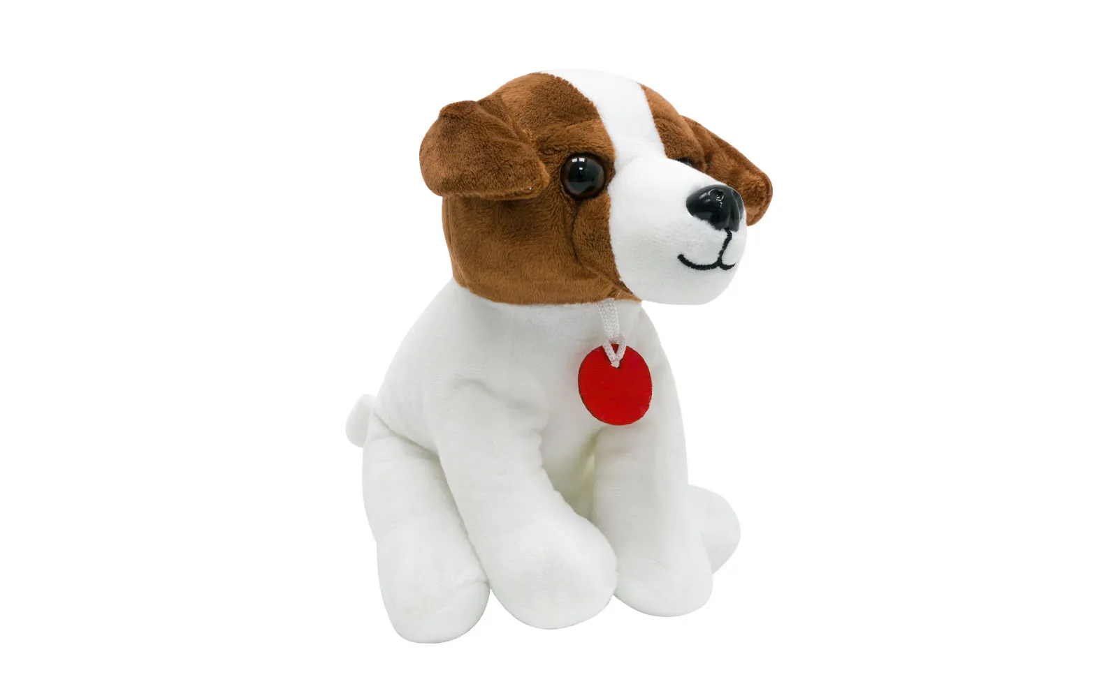 A wonderful white-brown plush sitting puppy in the size of 18 cm will become your child’s best friend.