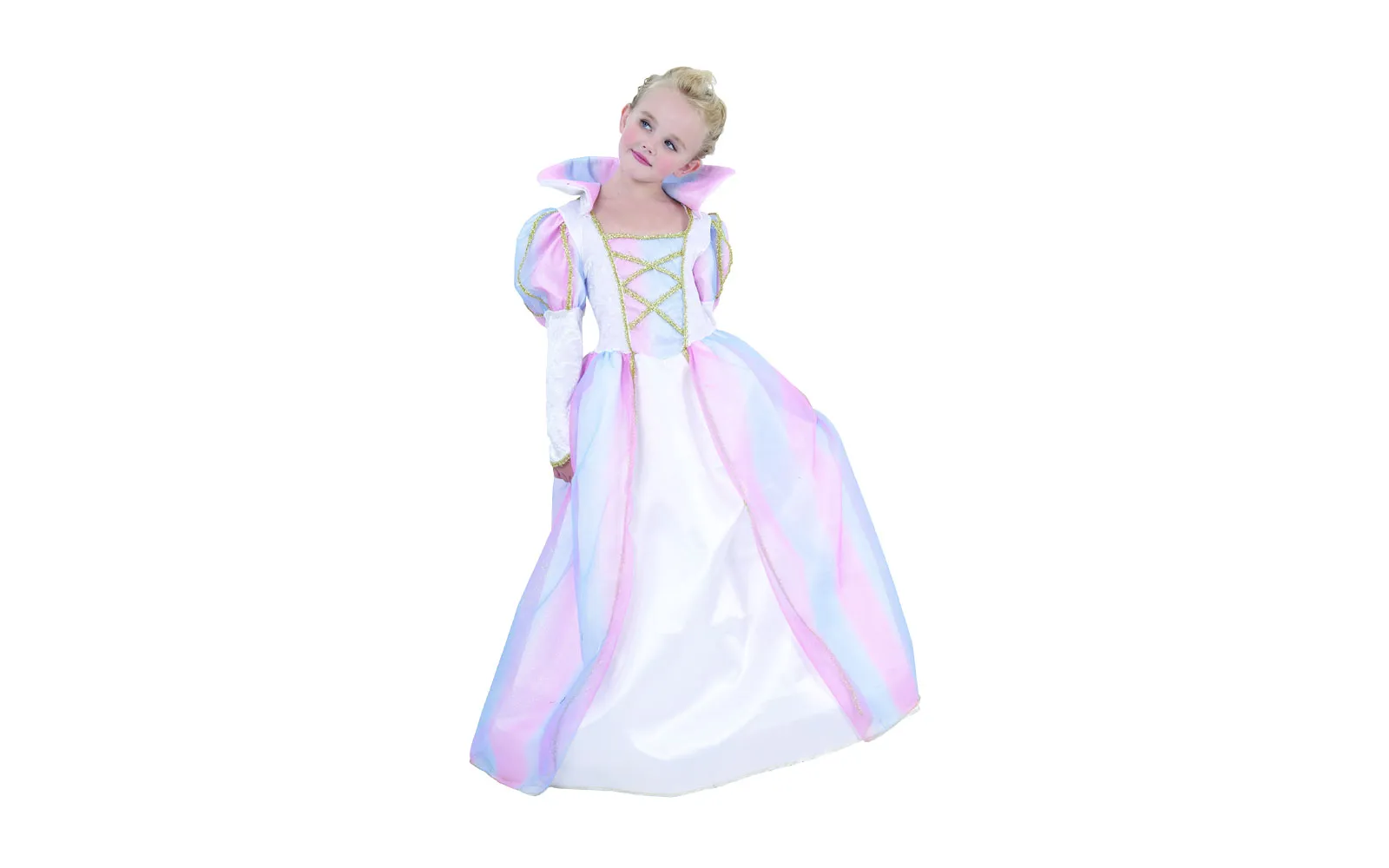 The children’s carnival costume of a princess in white-pink-blue colors with an emphasized collar includes a dress and a collar. Size S (110-120 cm), M (120-130 cm) and L (130-140 cm).