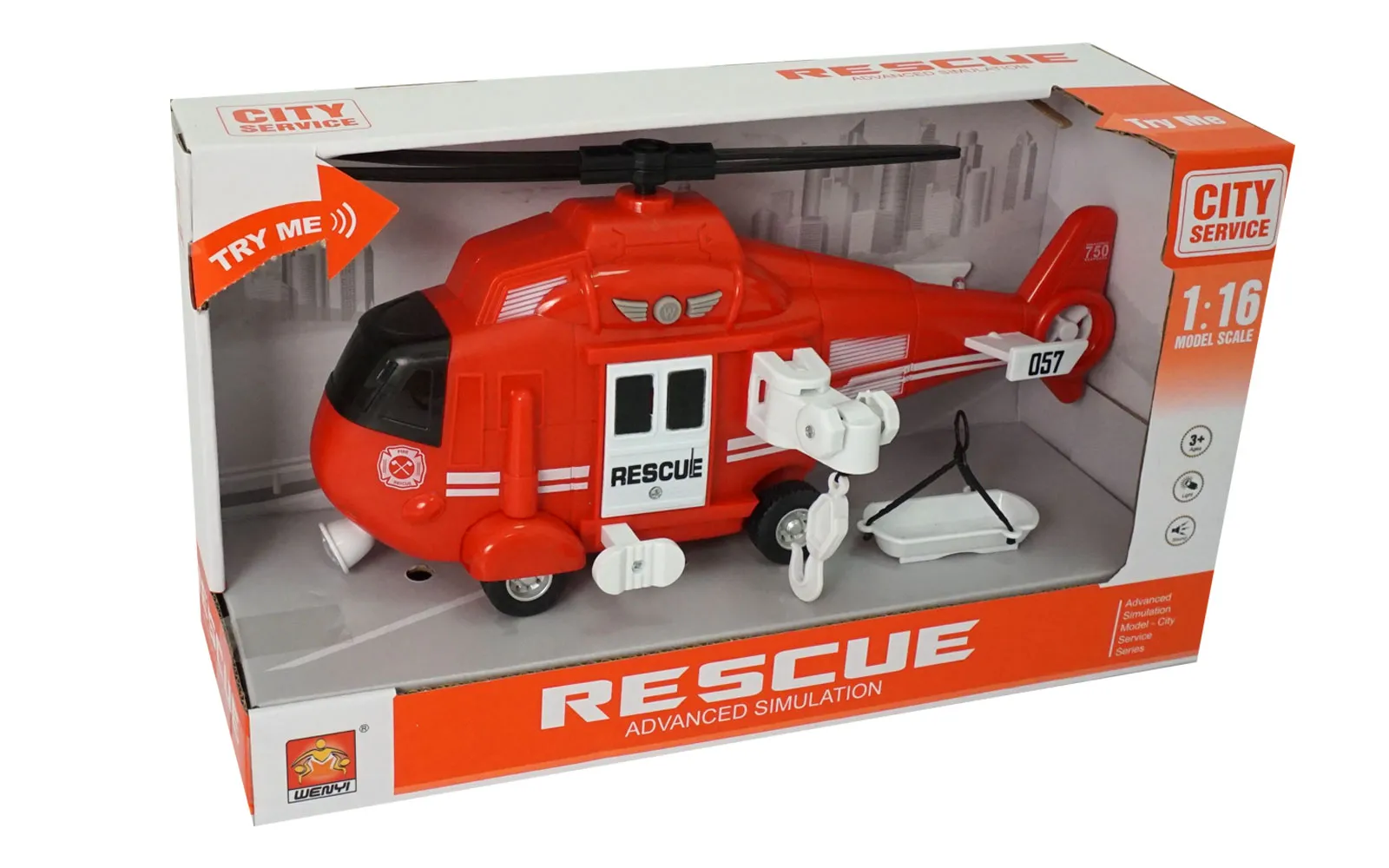 A battery-powered rescue helicopter of 30 cm size requires 3 AG13 (LR44) 1.5V batteries to operate. Press the button above the door. You will hear a sound and two lights will flash. By pressing the white button, the helicopter’s rotor will start rotating. By rotating two small white buttons, you lift or lower the attached rescue stretcher. The vehicle has a friction drive.