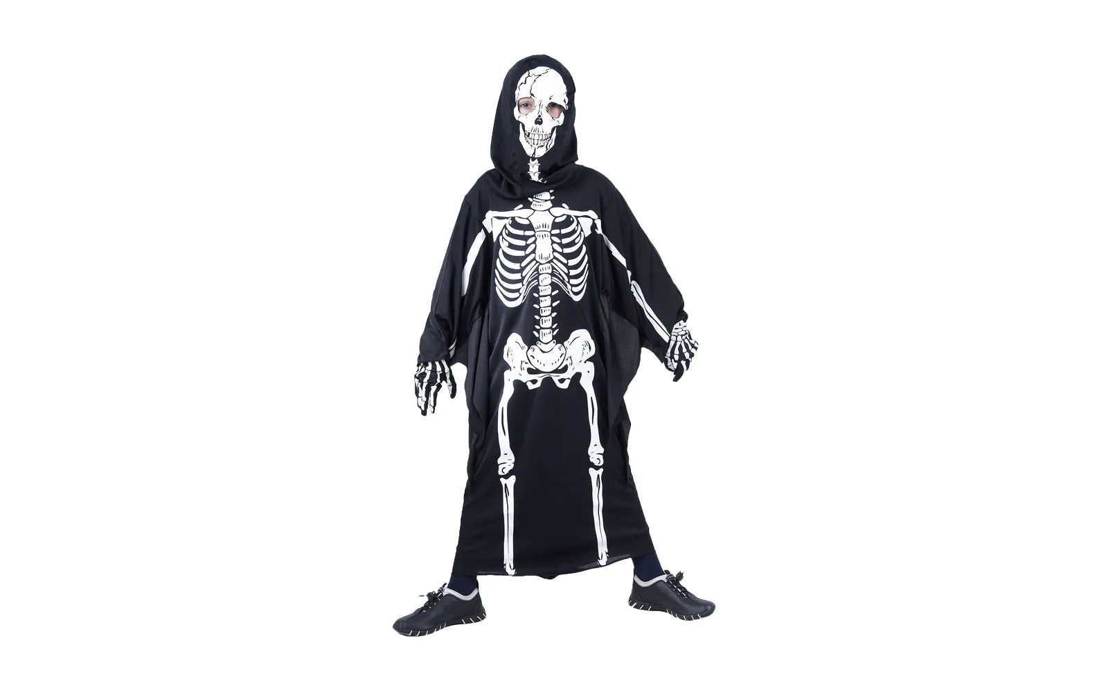 The children’s skeleton carnival costume includes a dress and a hood. Size M (120-130 cm) and L (130-140 cm).