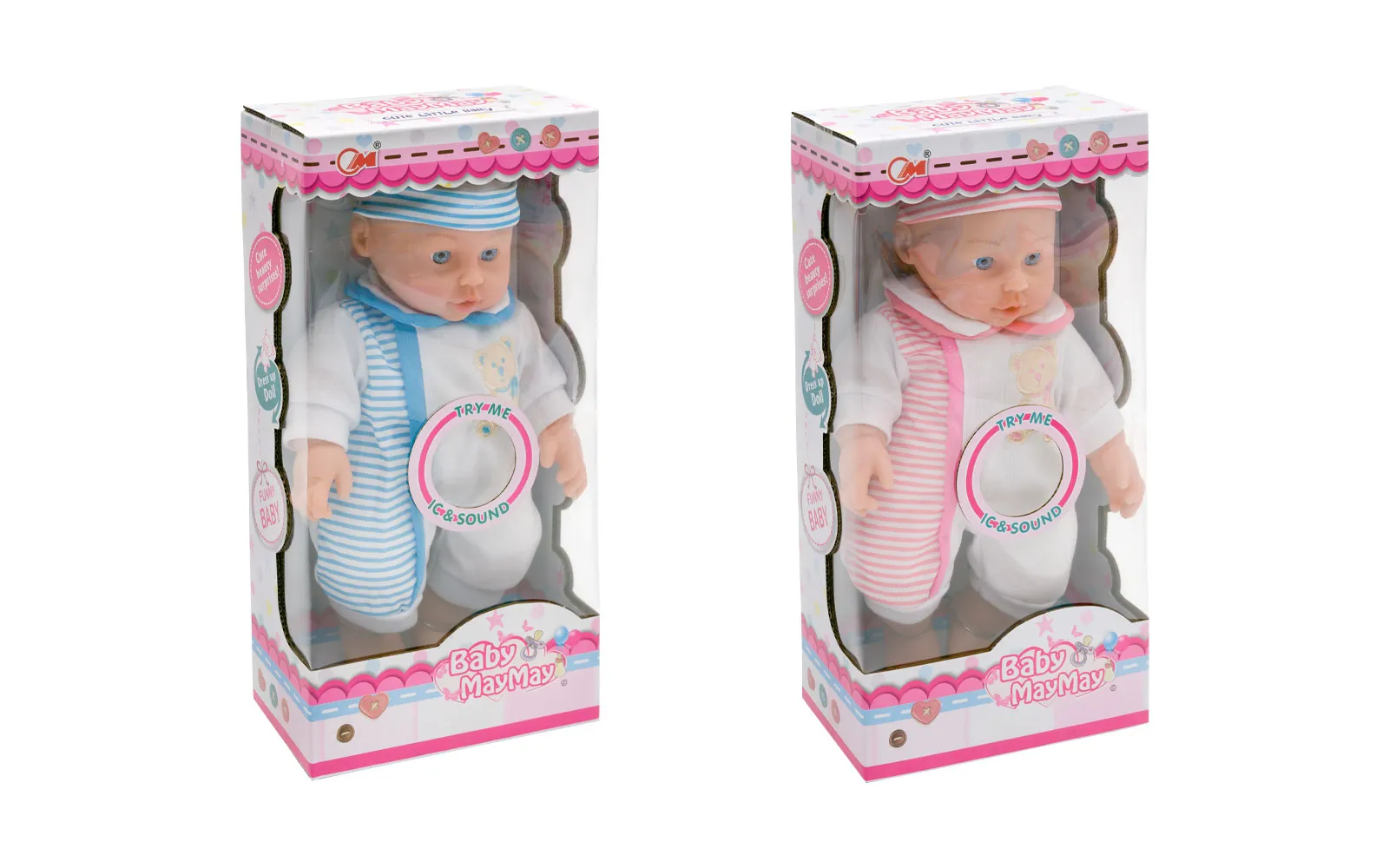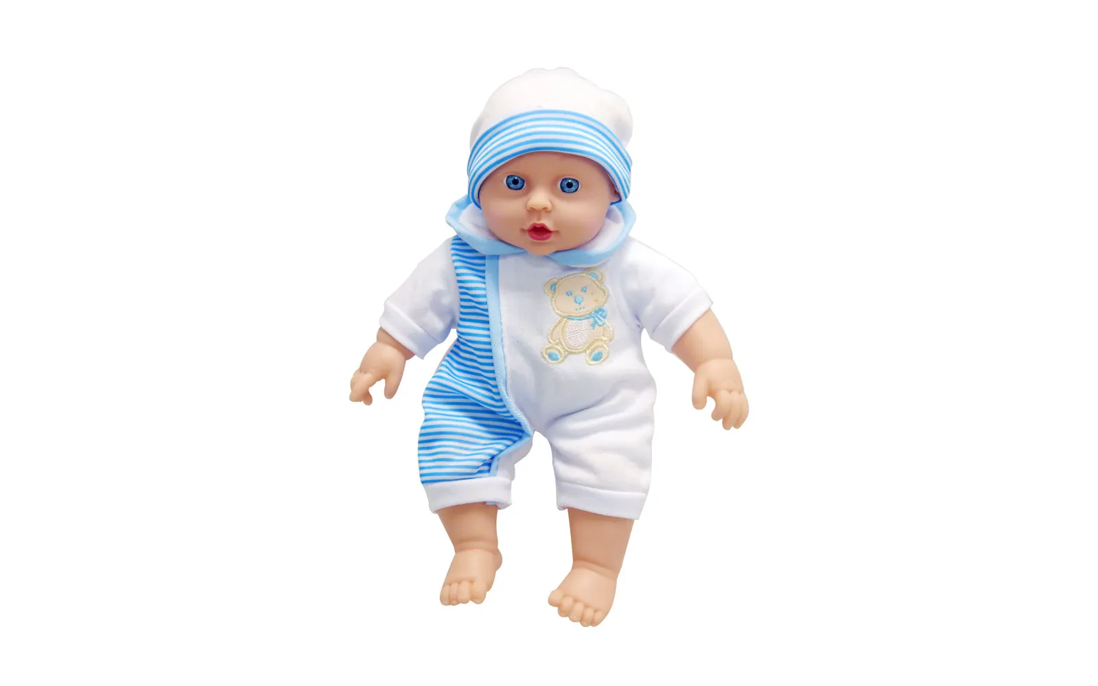 A cute baby in a jumpsuit and cap combination of white – pink or white – blue color size 30 cm, which makes a sound when you press on it.