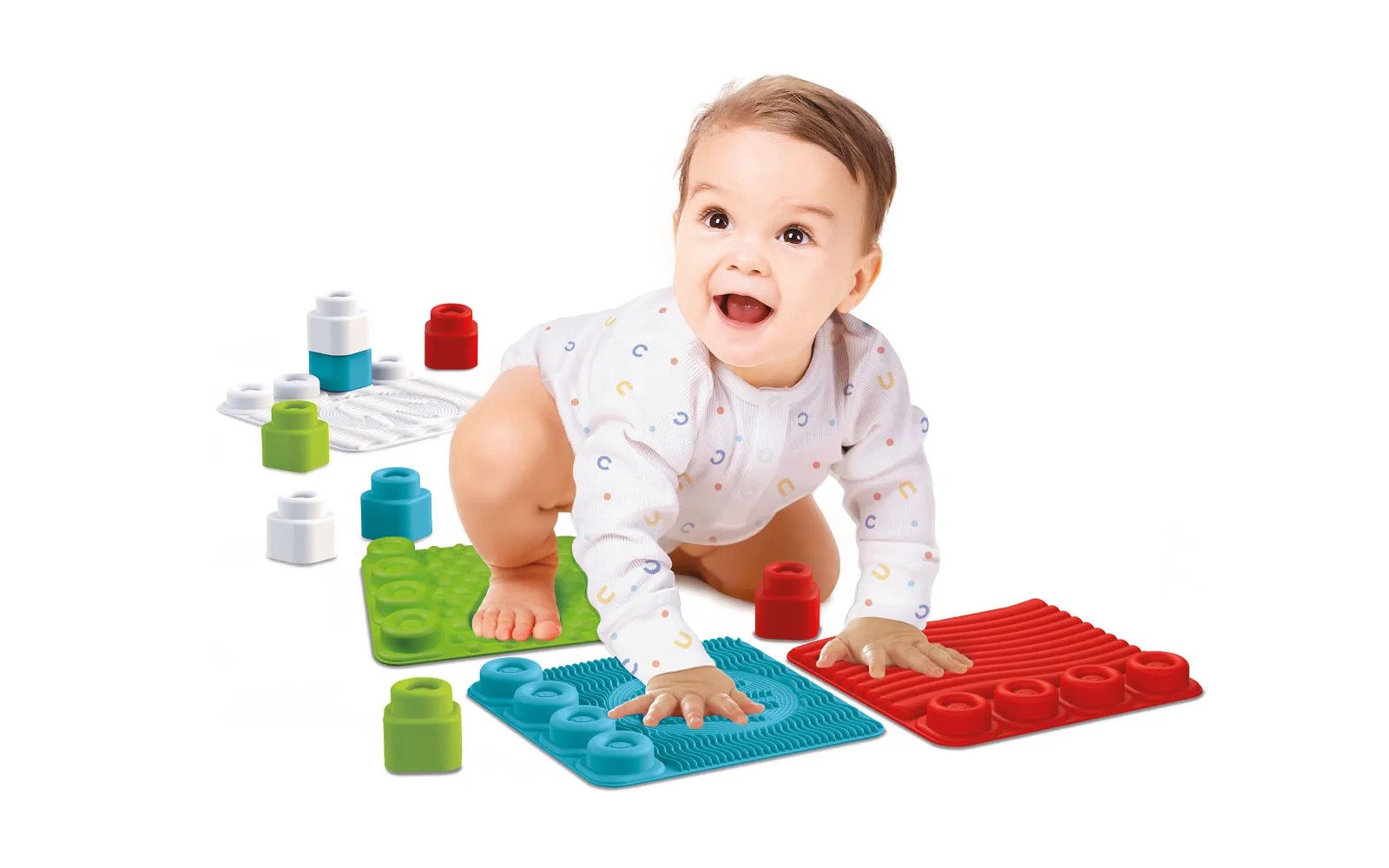 Clemmy soft mats and blocks for your youngest ones. Included are 8 soft blocks and 4 mats with different motifs and reliefs. They are suitable for children from 6 to 36 months old.