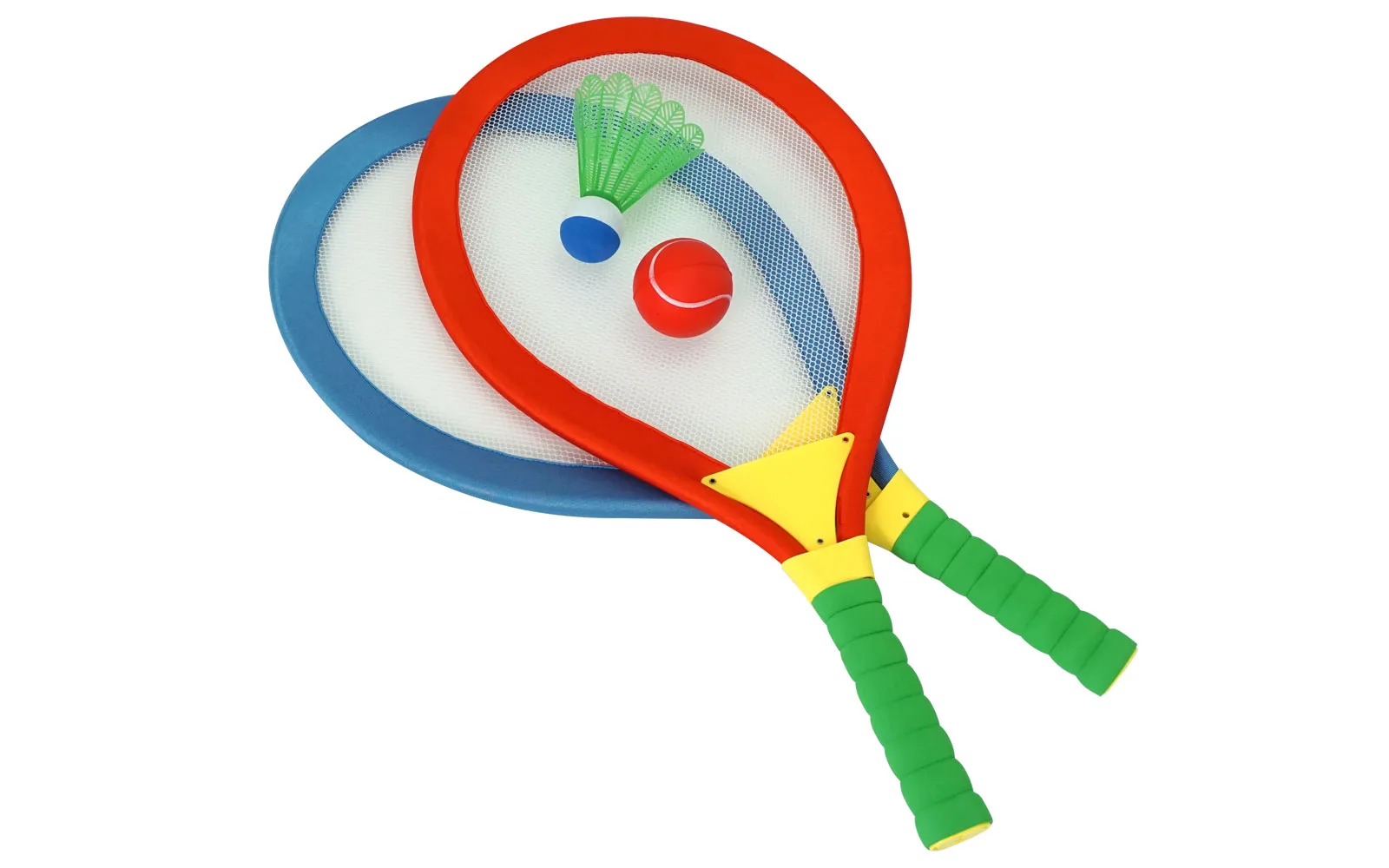 Set of two rackets with one soft round ball and one PVC badminton ball.