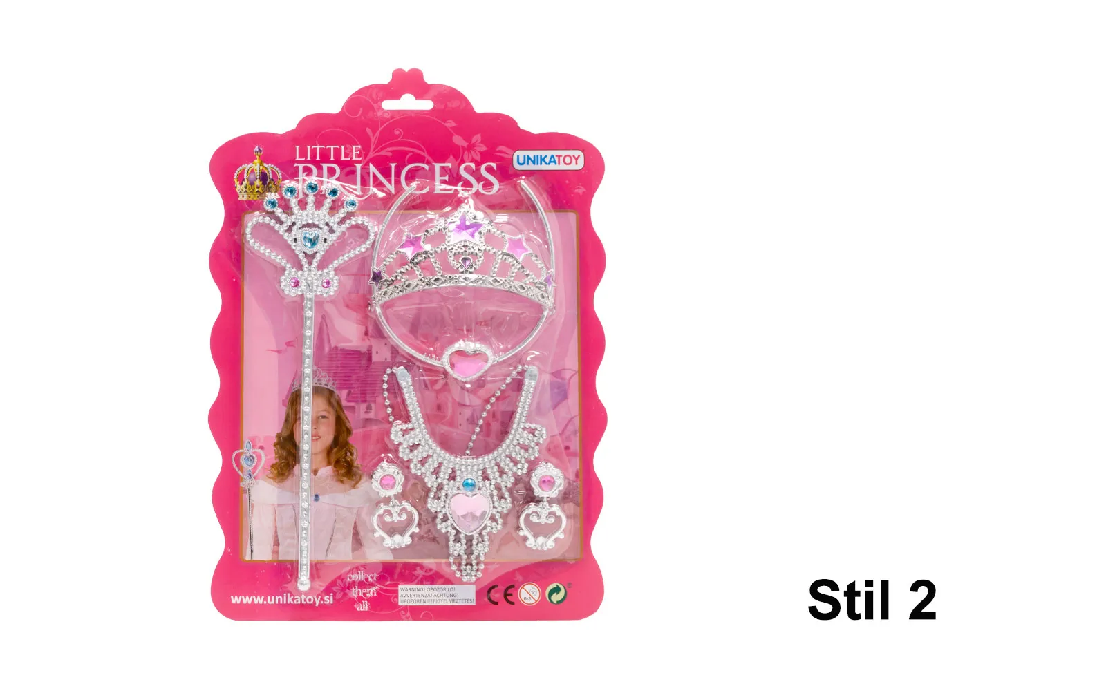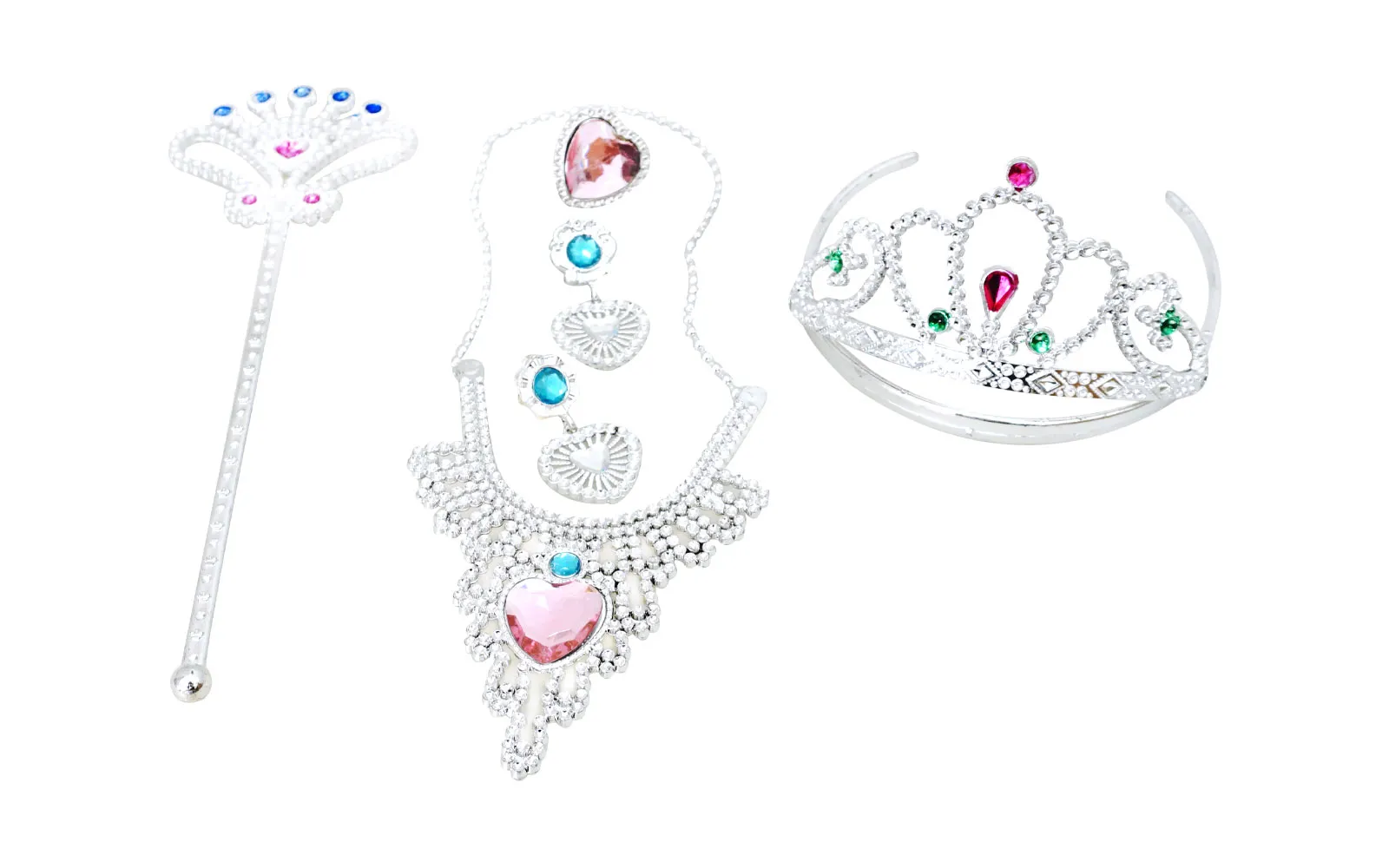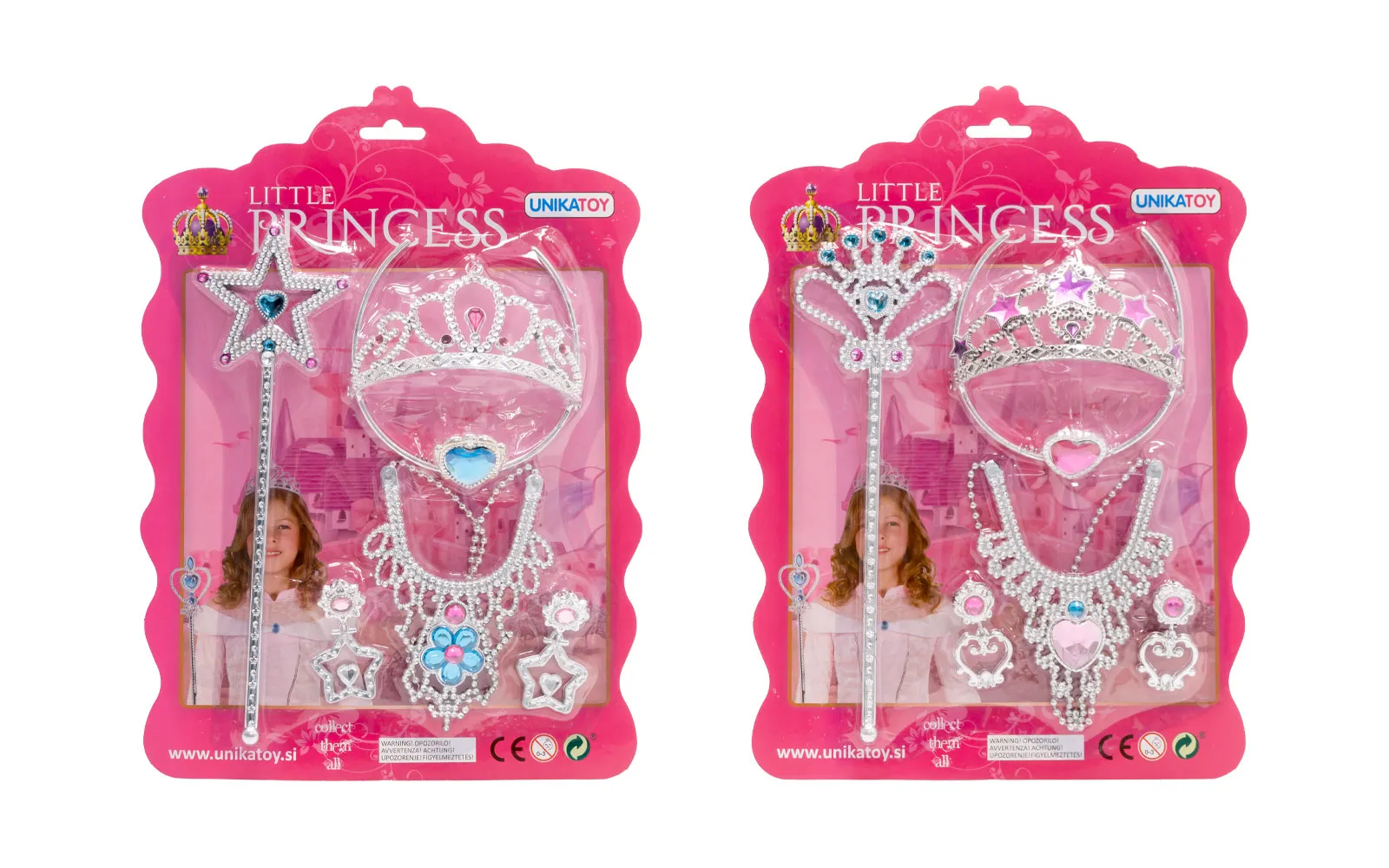 The princess party should start with a set of jewelry of two different styles, containing a wand, a crown, a necklace, and earrings.